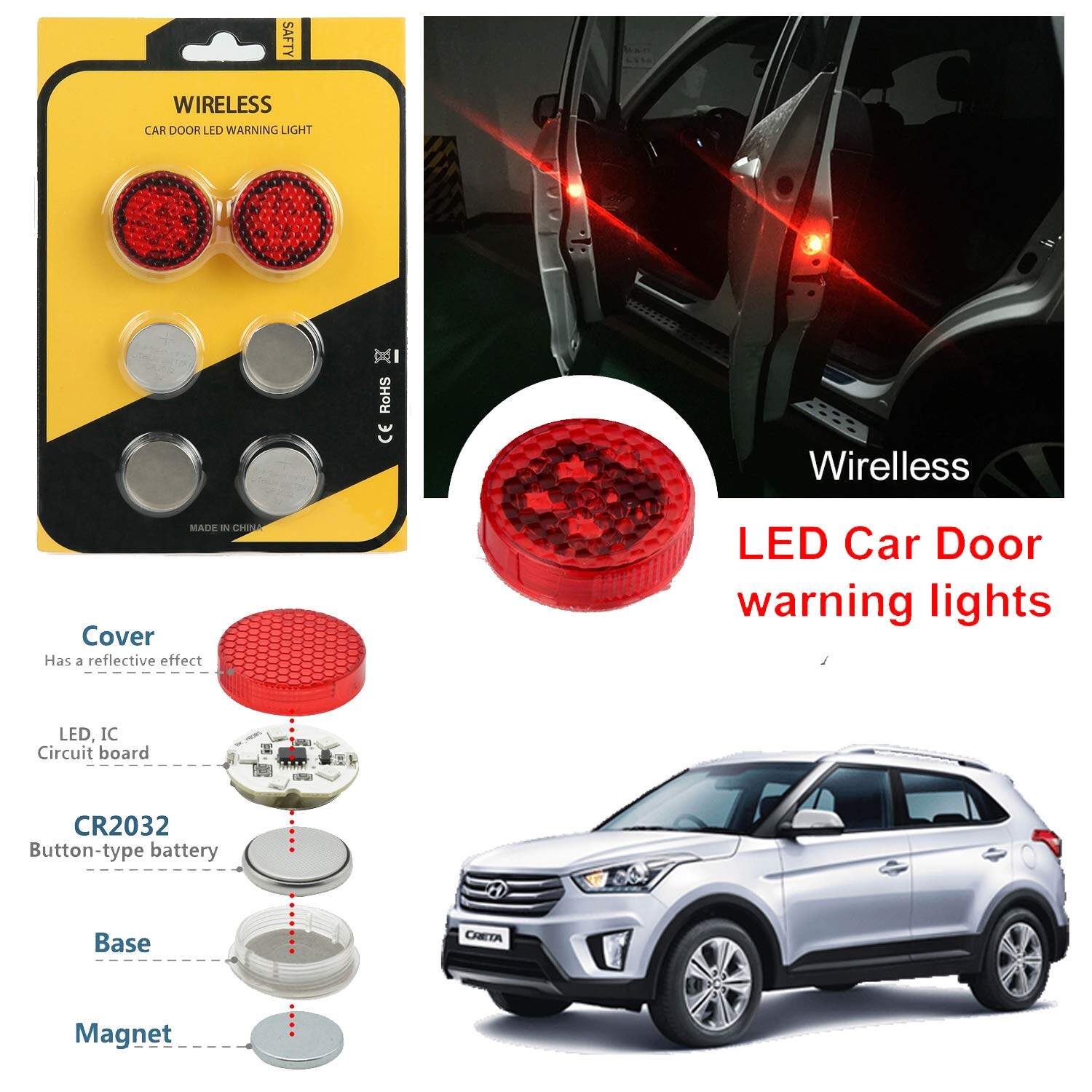 2PCS Universal Wireless Car Door LED Warning Light, Car Door Anti-collision Warning Light Sensor Light,Waterproof LED Strobe Flicker For Anti Rear-end Collision