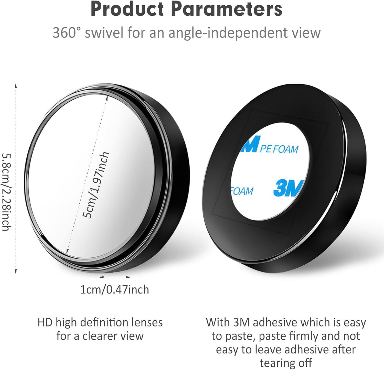Dead zone exists in every car rear-mirror. If you want to get maximum protection and safety while driving, it is a must-have to install a professional car blind spot mirror. Today we are so glad here to recommend you this 3R-035 High-grade Car Blind Spot Mirror 50mm in Diameter! It can be easily and firmly attached on your original rear mirror, for extending visual area in an efficient way. This blind spot mirror is in particular design with black frame and solid structure, full of third dimension. With the diameter of 50mm, it is fully compatible with any car. Possessing it, you will get much clearer and specific acquaintance about road condition. Such an exquisite blind spot mirror is absolutely your super equipment!