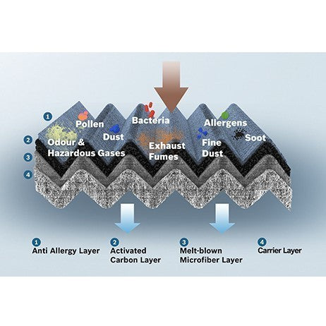 PRODUCTS DESCRIPTION:Harmful pollutants like dust, pollen, fungus and foul smelling gases fill the air in the car leading to health related issues. Cabin filters from Bosch absorb up to 100% of all pollen, dust particles and foul smelling gases and other harmful pollutants entering the vehicle’s interior through its heating, ventilating and air conditioning systems, assuring a healthy and hygienic ambience inside the car