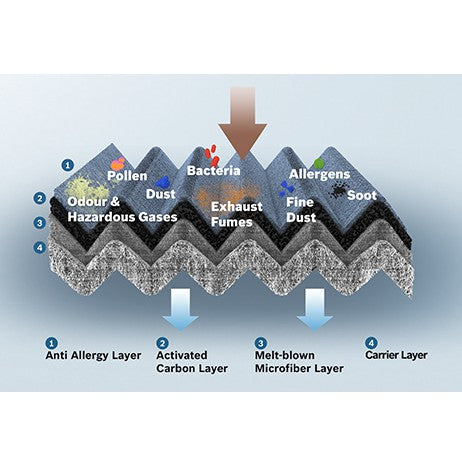 Bosch Cabin Carbon Air Filters are specifically engineered for the professional installer dedicated to helping customers breathe cleaner air. Bosch Cabin Carbon Filters offer an 80% efficiency rate at 3 microns or greater in capturing dirt, dust and other environmental contaminants from entering the heating and air vents of a vehicle.