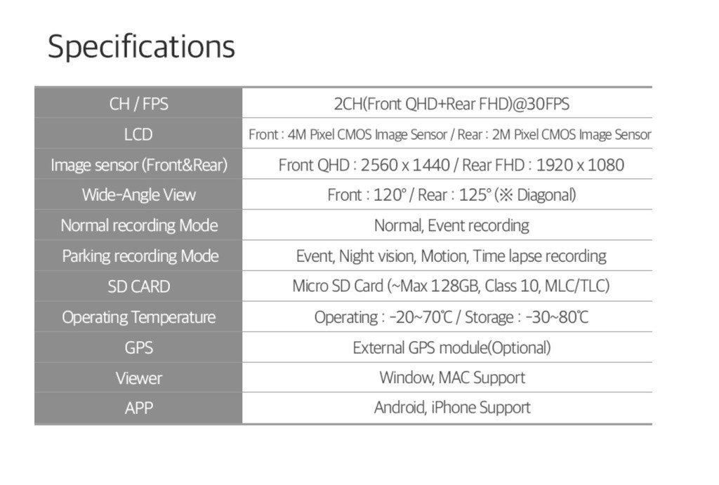 ⚙️ Video Resolution - Front QHD 2560x1440p Rear: 1920x1080p